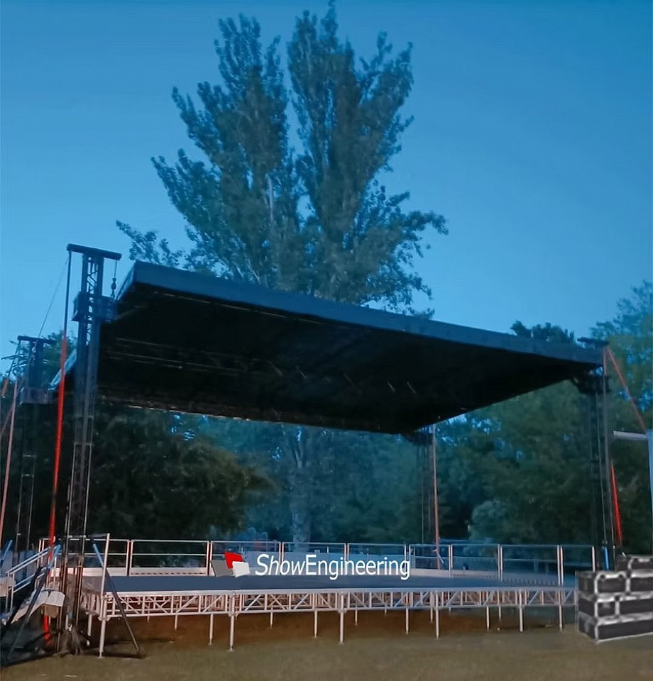 - Palco in acciaio costituito da moduli di mt 2×2 e realizzabile in varie altezze, che vanno da cm 100 a cm 150; completo di parapetti e con una o più scalette.